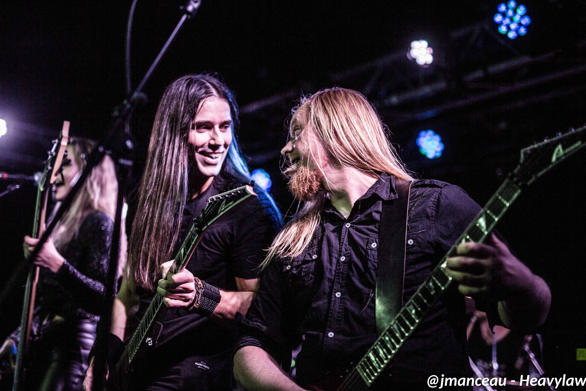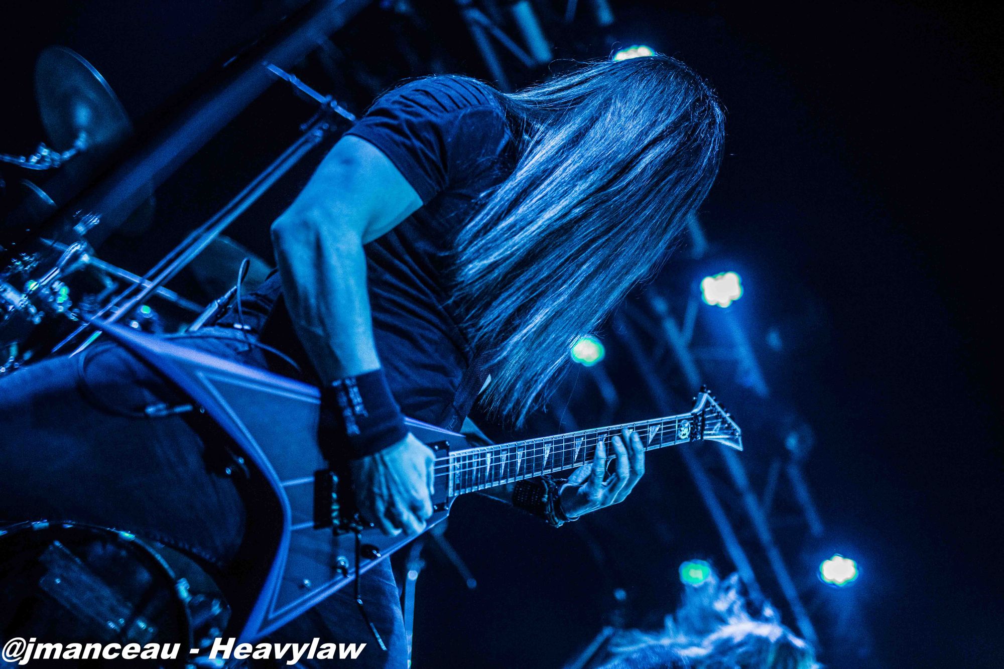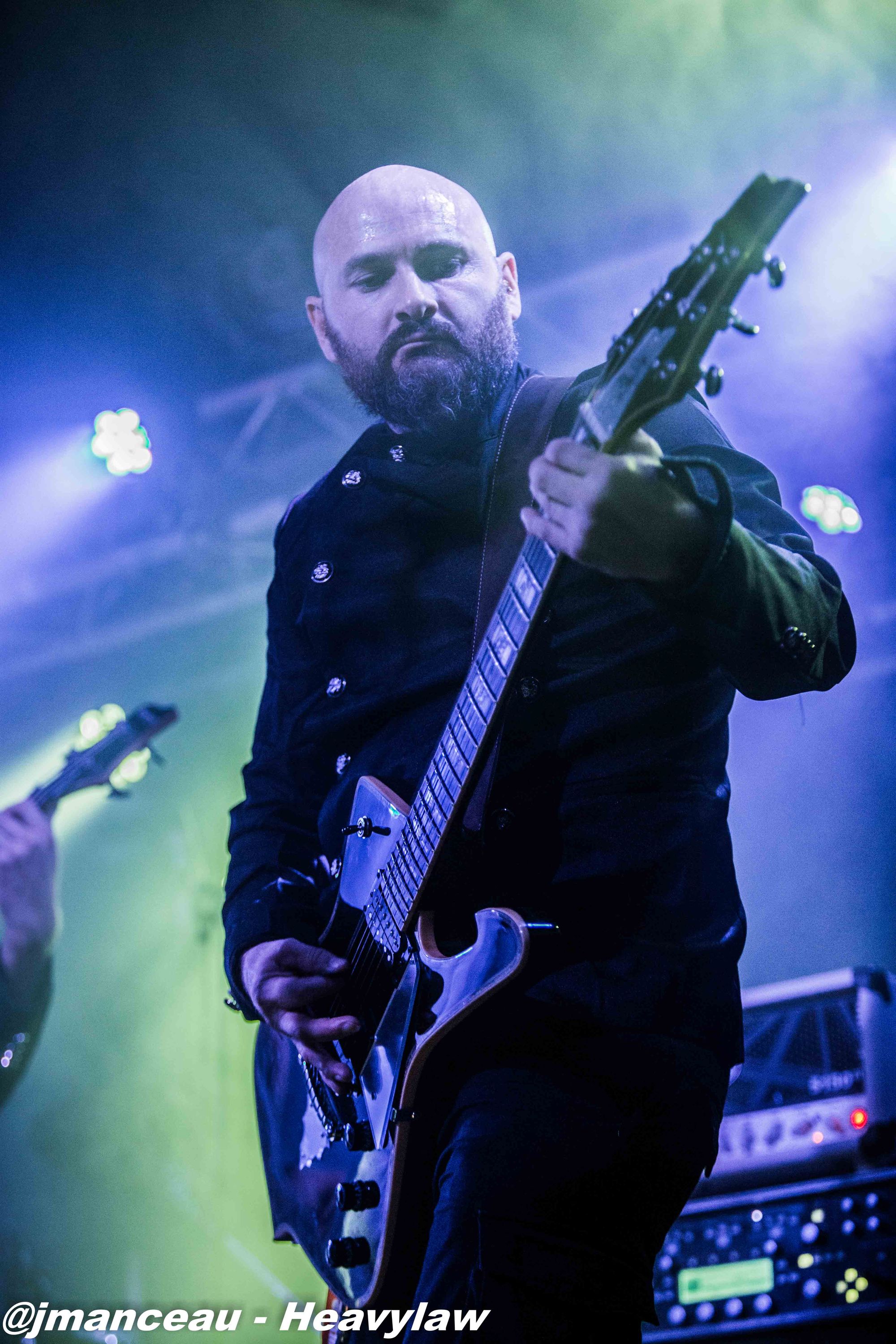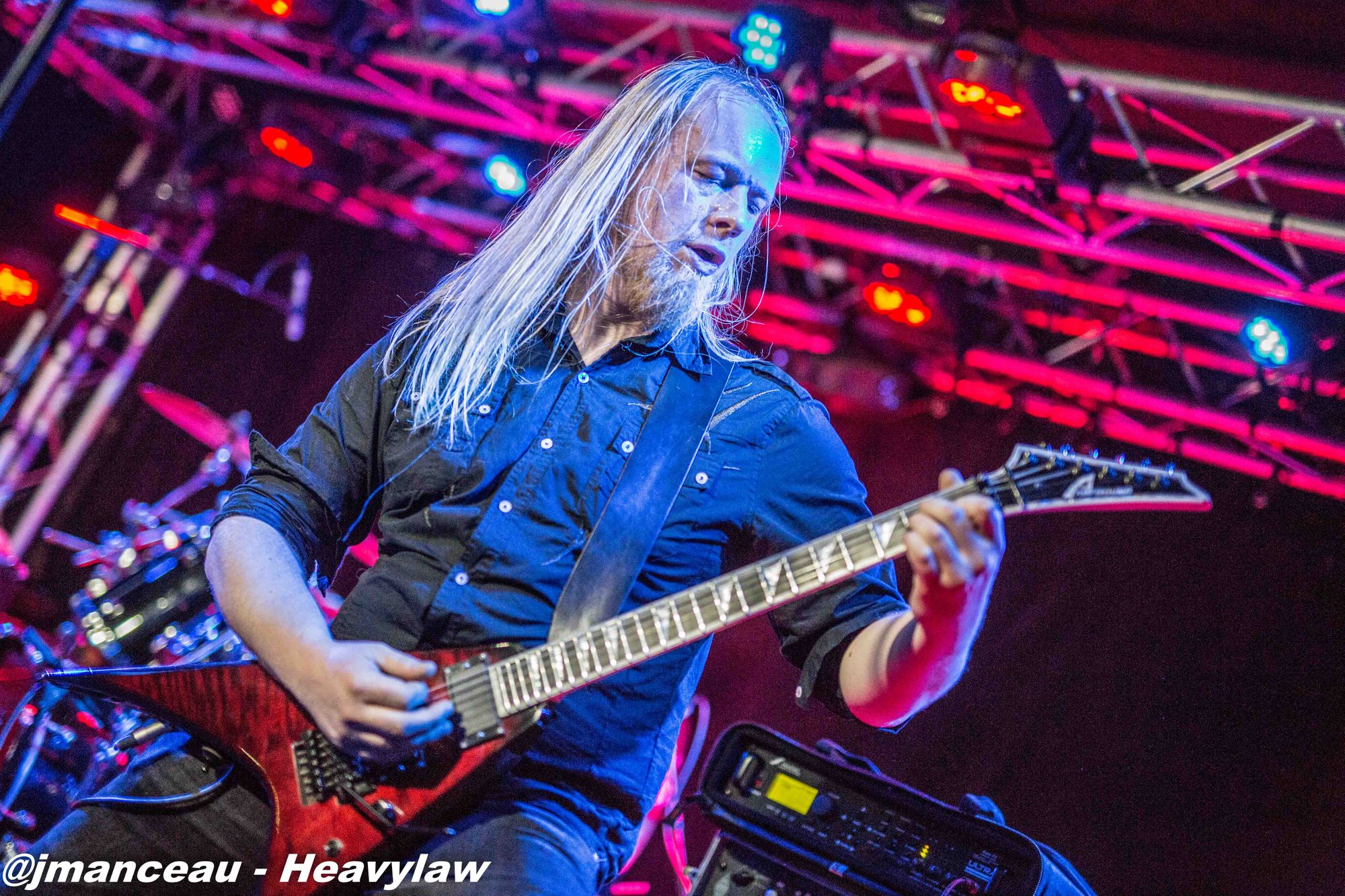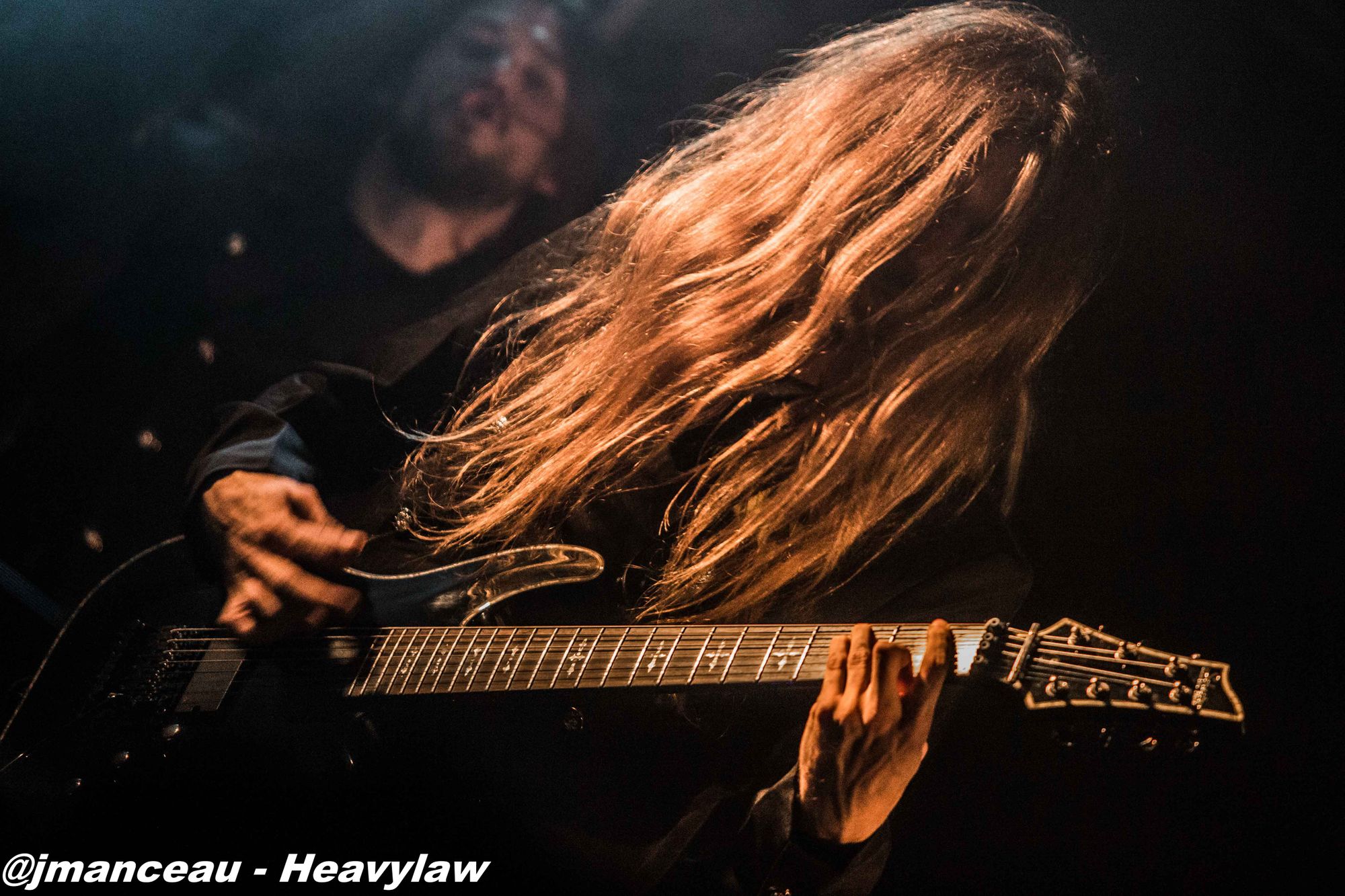 De part et d’autre de la scène, nous avons le pilier fondateur Morten Veland, vissé sur la droite en véritable stéréotype du norvégien, le grand viking costaud, qui dégage une espèce de force tranquille à la Basse, et entre deux bières gère aisément ses parties de chant guttural. Et complètement sur la gauche, le dernier arrivé dans le groupe et deuxième français sur scène (cocorico) Nils Courbaron, tout en maitrise et technicité à la guitare, qui passe également derrière le micro pour assurer le chant clair sur quelques titres.