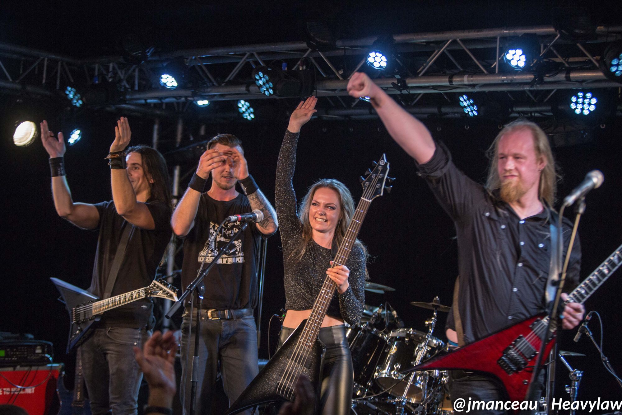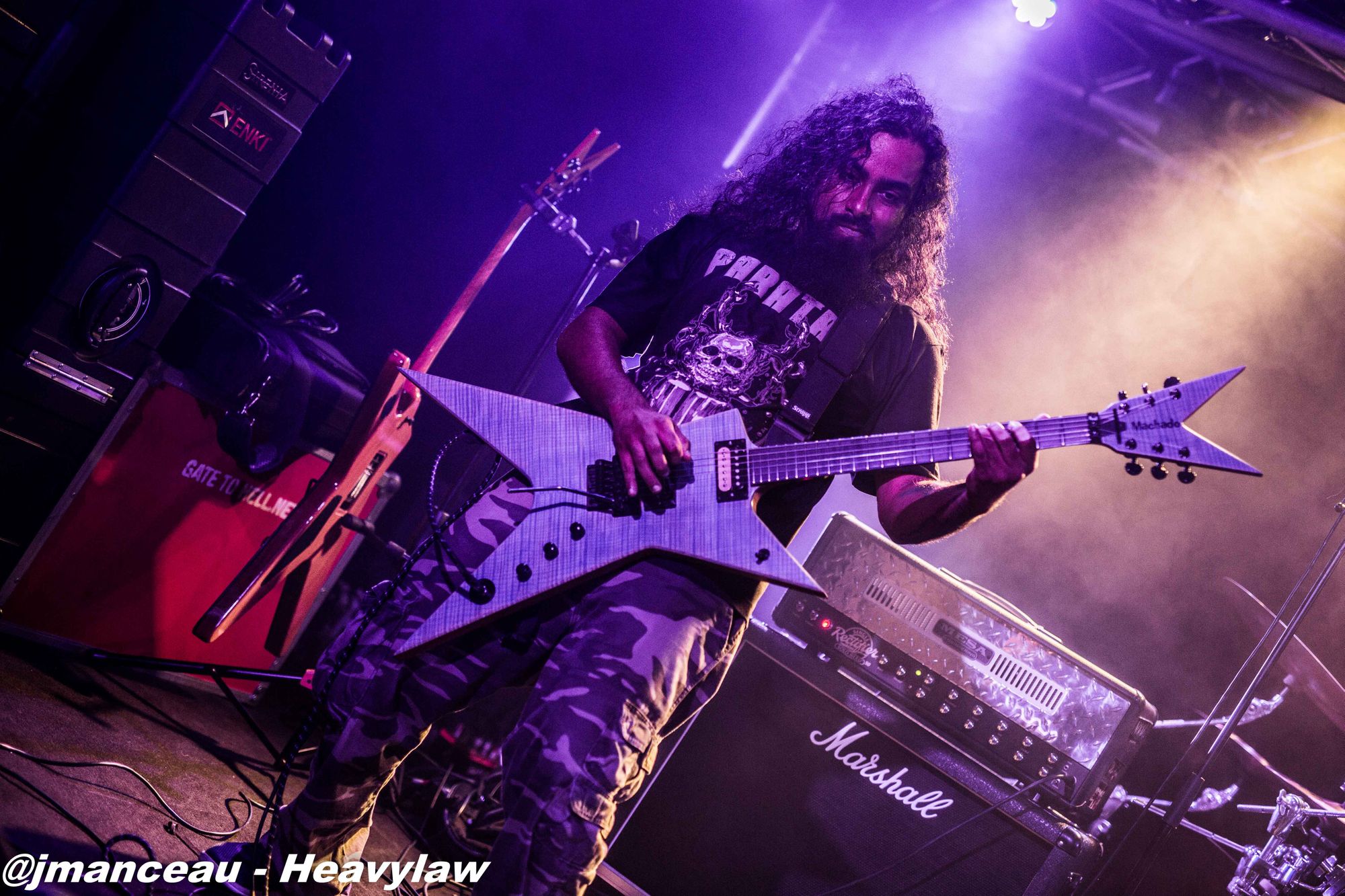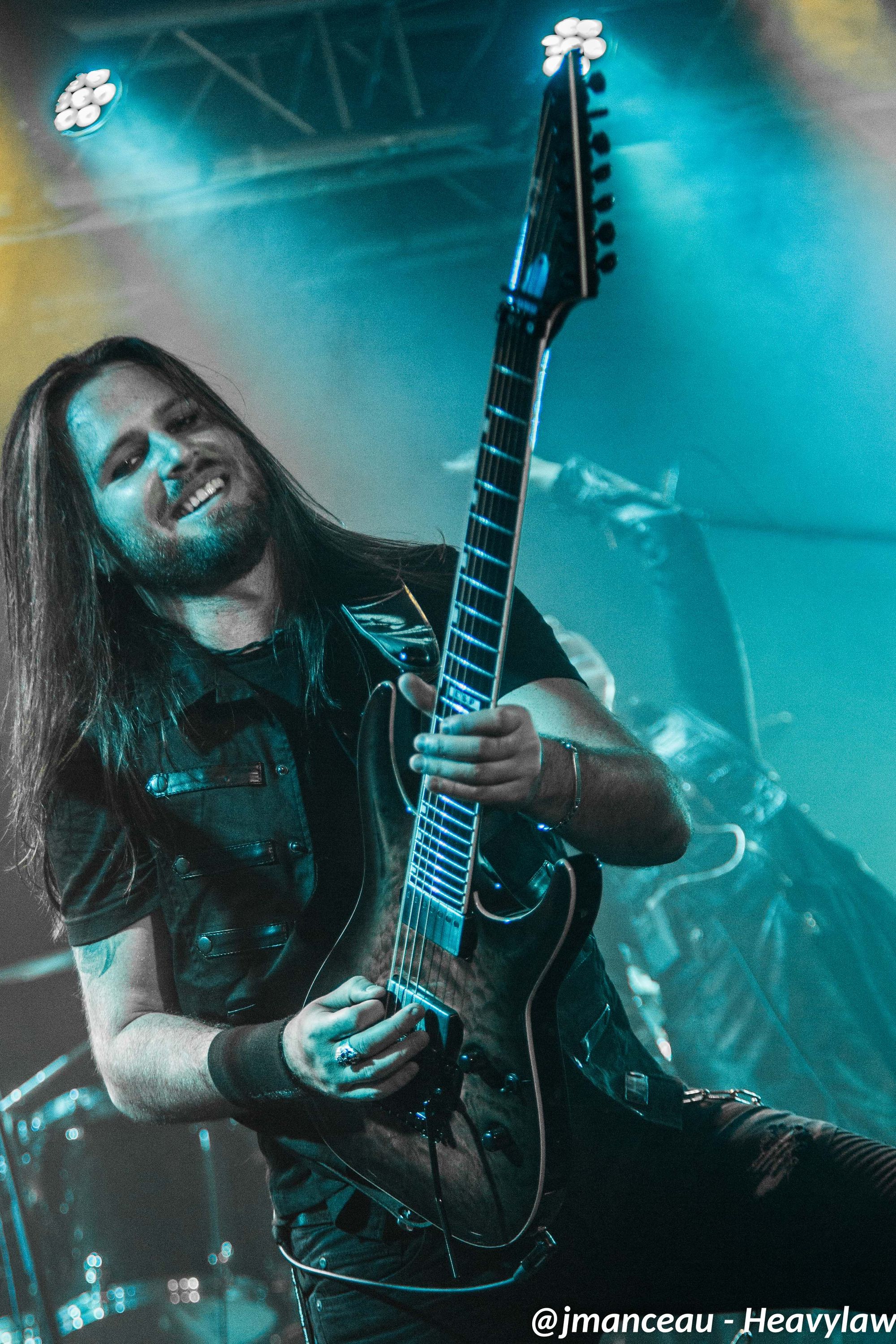 Les guitaristes œuvrent sur de sublimes instruments de la marque finlandaise Amfisound. Les deux guitares et la basse taillés en pointe façon kingV, apportent visuellement une touche d’agressivité qui vient parfaitement s’associer à leurs riffs puissants et incisifs.