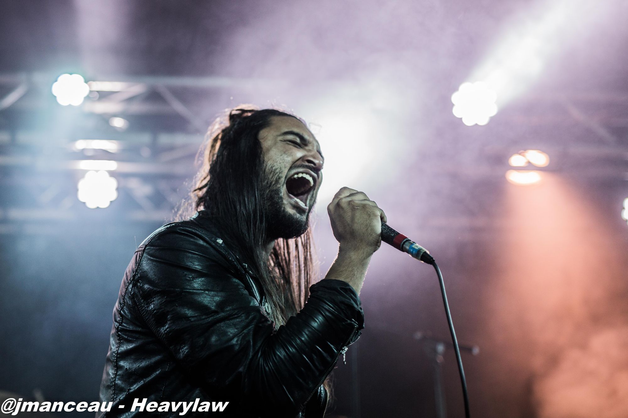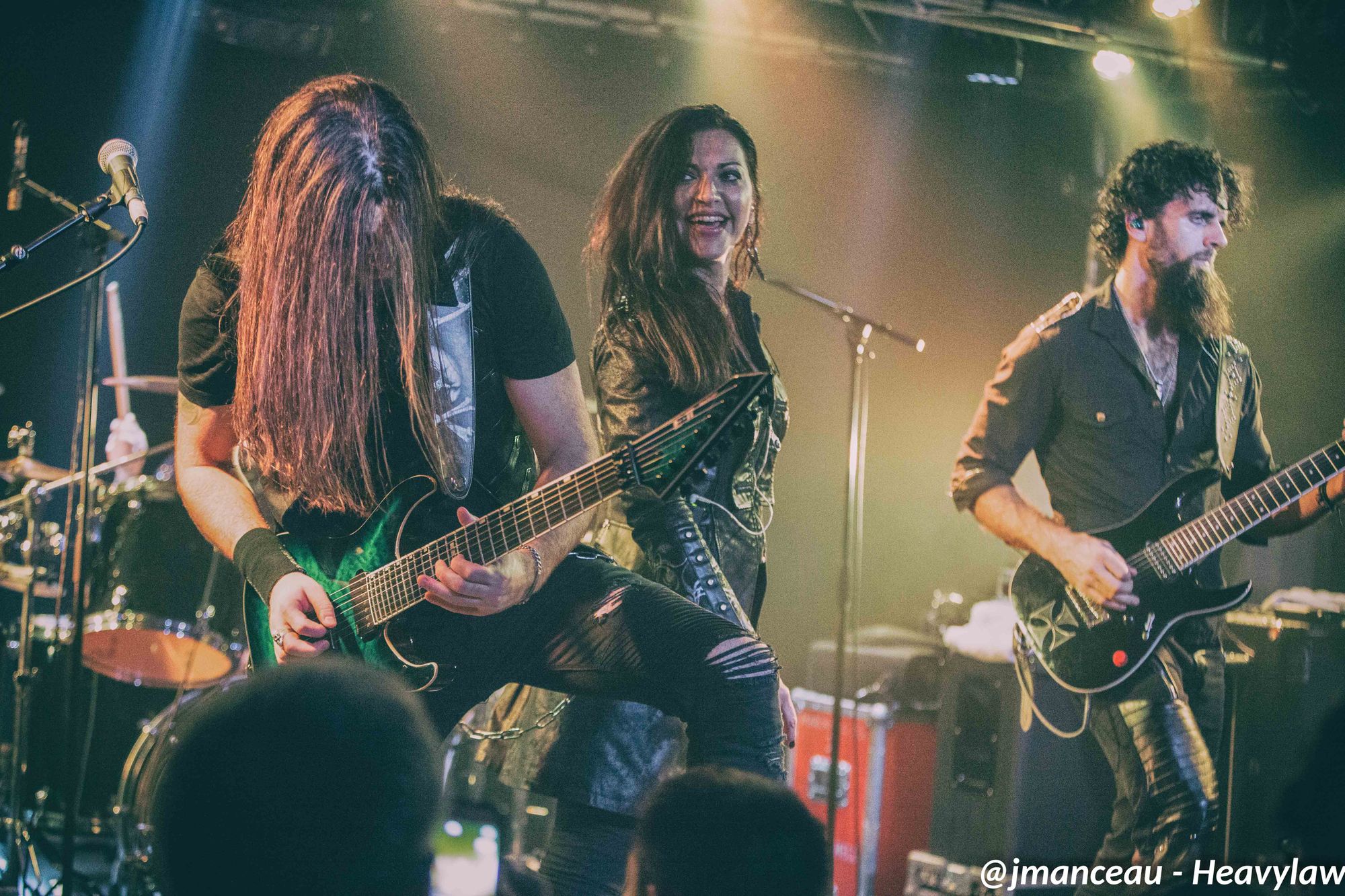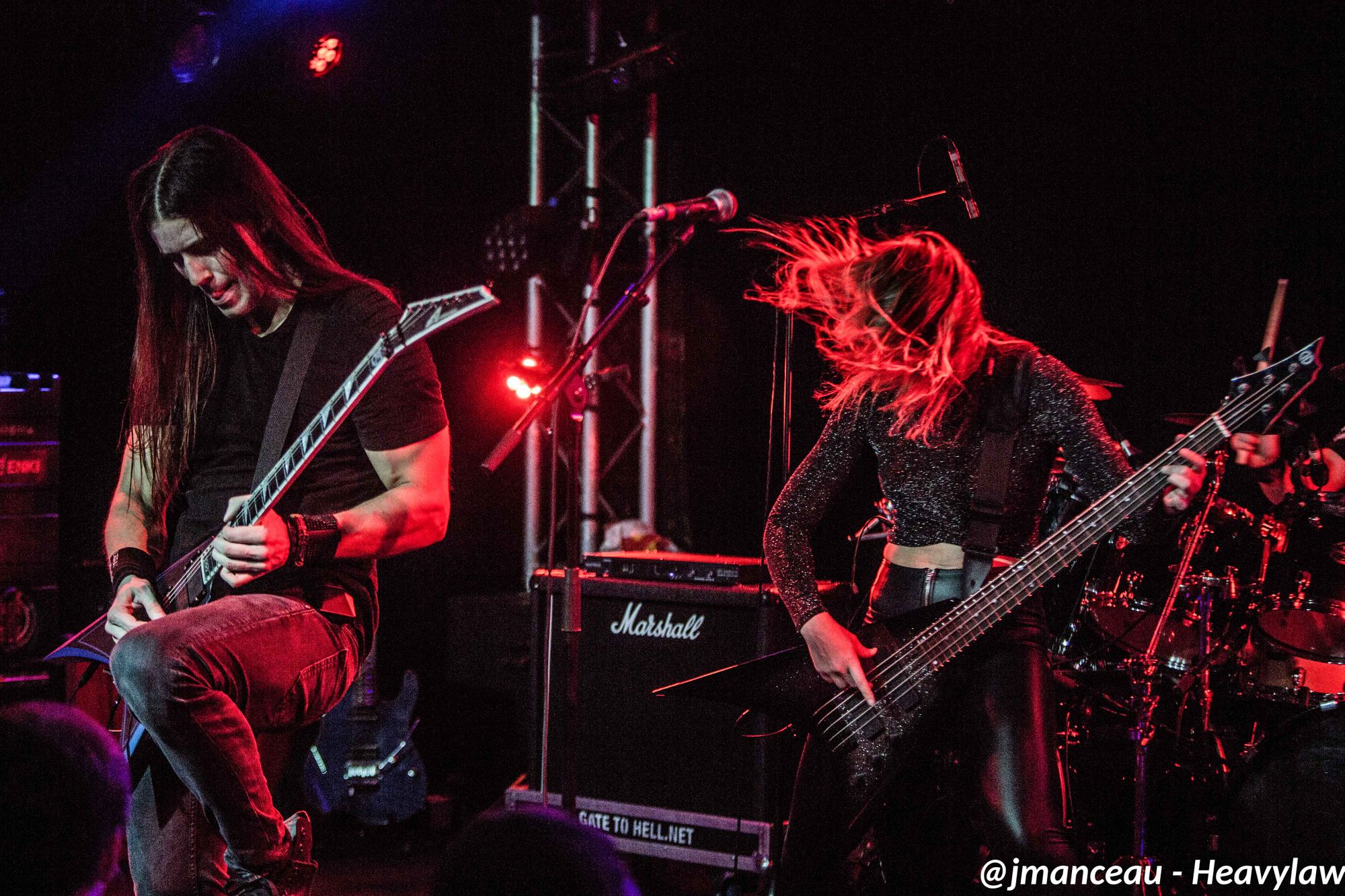Les guitaristes œuvrent sur de sublimes instruments de la marque finlandaise Amfisound. Les deux guitares et la basse taillés en pointe façon kingV, apportent visuellement une touche d’agressivité qui vient parfaitement s’associer à leurs riffs puissants et incisifs.